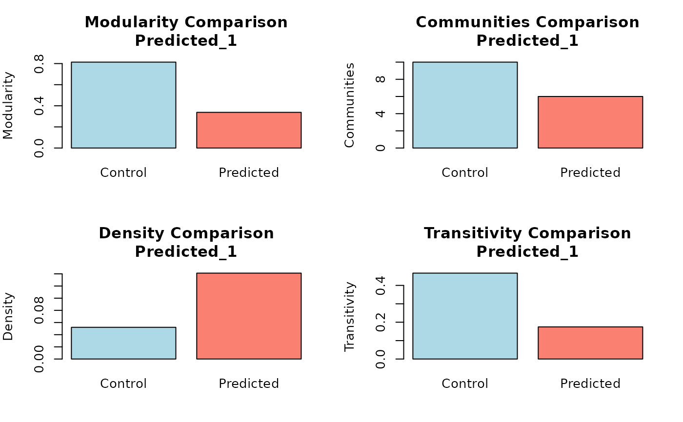 This function requires the fmsb package for radar chart visualization. The radar plot shows normalized community similarity metrics. The bar plots compare raw topological properties between predicted and control networks.